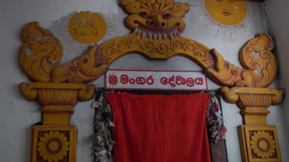 About 22 km from Balangoda along the Kalthota road, on the left side of the route within the Thanjanthanna temple grounds, lies the Mangara Devalaya. Mangara Deviyo is considered a regional deity especially revered in Ruhuna and Bimthanna areas. The deity is highly respected by forest dwellers, and its worship is believed to protect cattle and agricultural resources, essential for the livelihood of farmers. Devotees seek blessings for the welfare of cattle, livestock, and general prosperity. Research indicates that Mangara Deviyo represents a Bodhi animal praying for the future Buddha. According to legend, during its thirteenth birth, Mangara Deviyo was born as Budasirū to the royal family in Maya country, because the royal couple was childless. The rituals offered to Biswa Deviyo thereafter commemorate this birth. According to traditional practices, at age 19, Budasirū dies due to a ritual involving cattle, and its divine spirit reincarnates. This divine spirit, now known as Mangara Deviyo, became widely worshipped among the people.